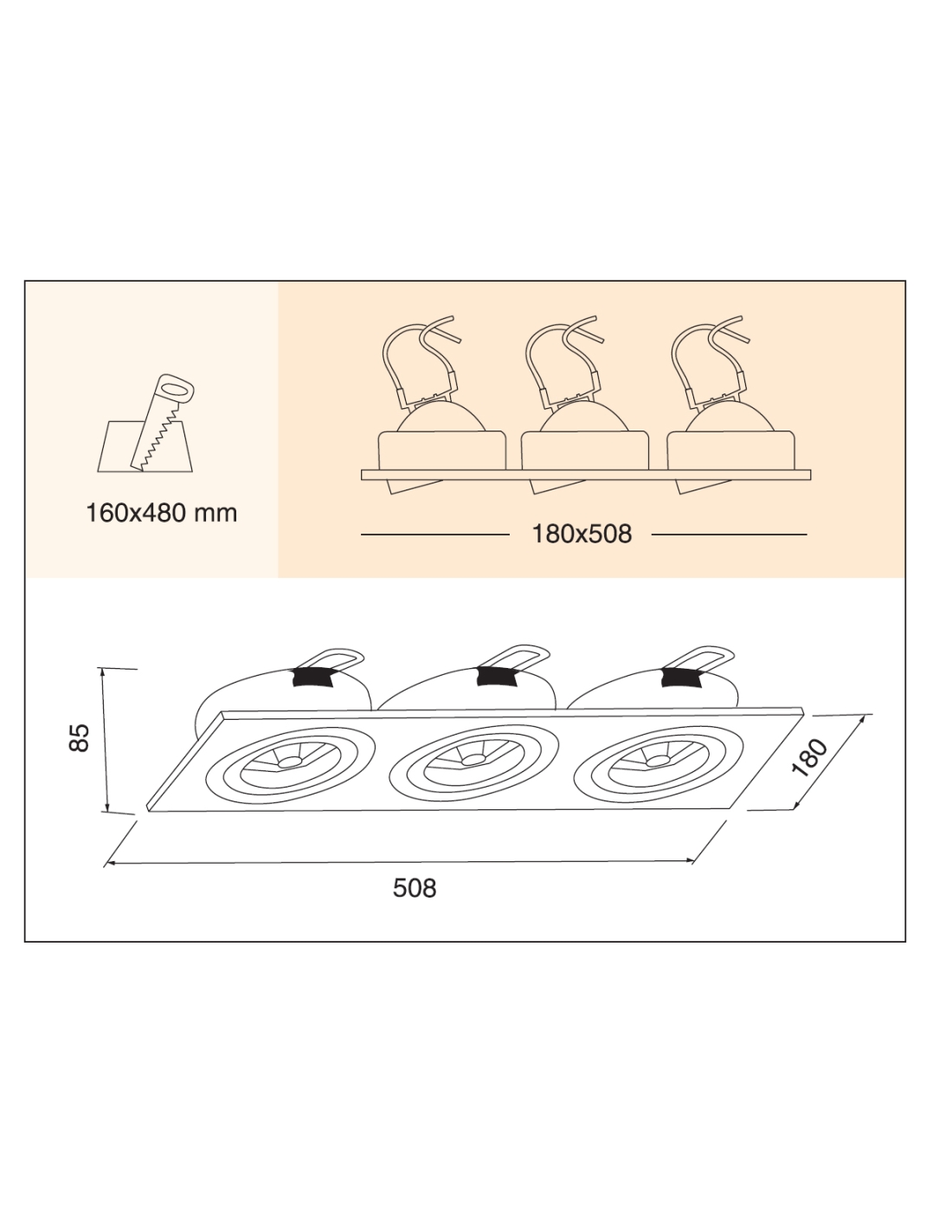 - 160x480mm / 185x508 / 508x180x85